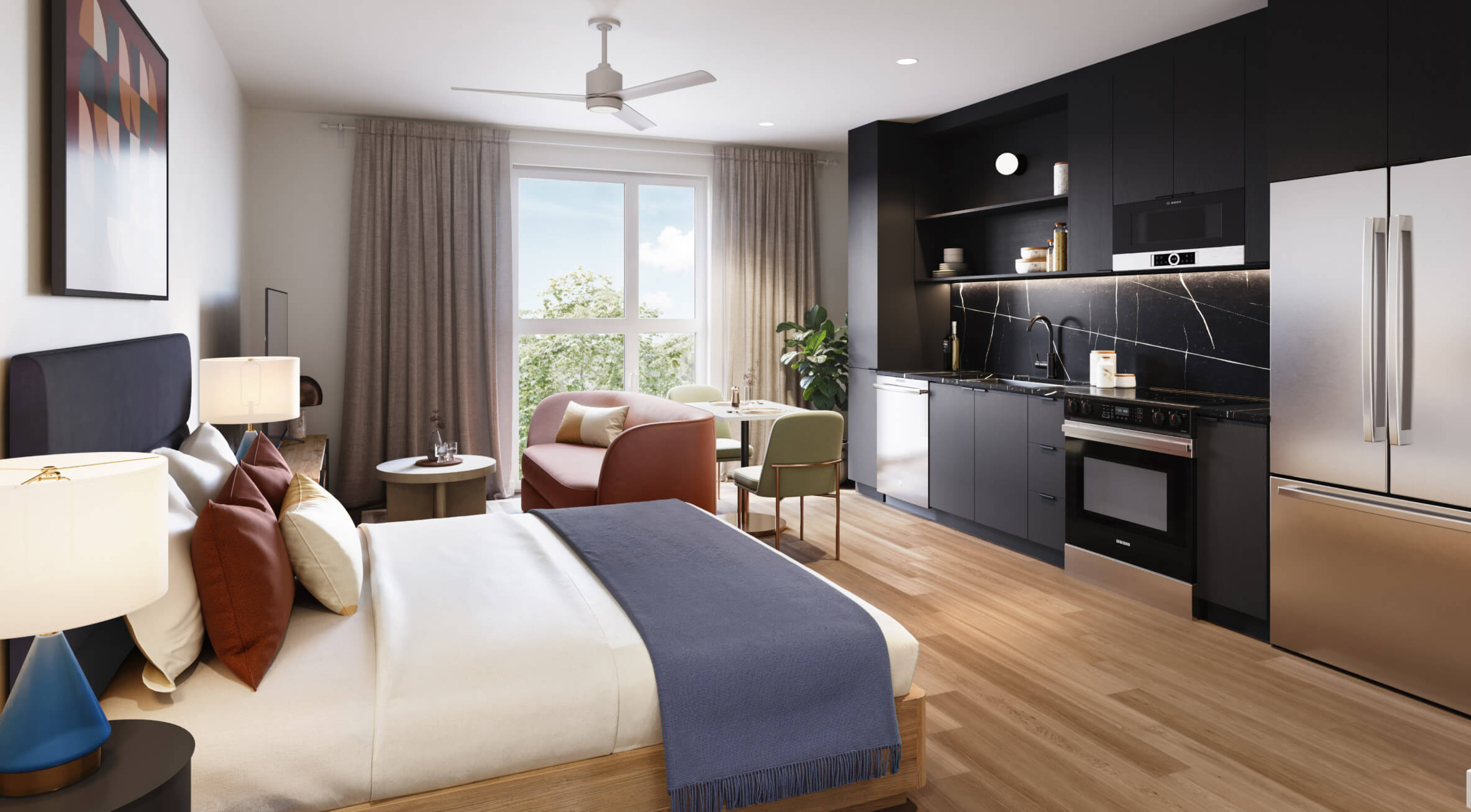 Essential space, zero compromise. A real bed, a chef-ready kitchen, and work-from-here comfort. Hotel-level service when you want it, privacy when you don’t. Designed for travelers who know the best part of Austin is right outside the door.